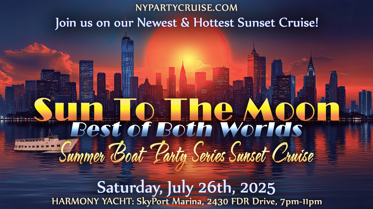 This Summer, Enjoy the Best of Both Worlds under the Sun and the Moon on our Most Popular Sunset Cruise Event, the "Sun To The Moon: Best of Both Worlds" Summer Boat Party Series. Board a Beautiful Yacht while the Sun is still shining, Watch the Sunset over the Breathtaking NYC Skyline while Dancing with your Friends, and Sail your way into the Moonlight. Food & Drinks are available for purchase, as well as bottle service, if you're interested in adding to your night out on the water. Take in the most amazing views of the NY Skyline, the Statue of Liberty, and more iconic NYC landmarks along the water. There really is nothing like experiencing a night out on the water with both the sun and moonlight as your backdrop for those epic memories that will last you a lifetime!